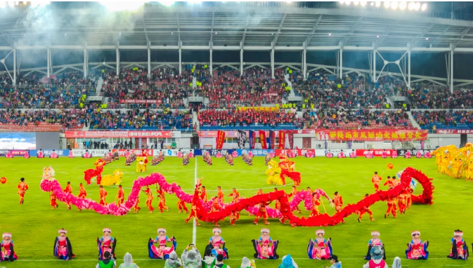 足球的攻防转换、传接配合,与非遗表演的起承转合、节奏起伏,竟异曲同工。开放的绿茵场就像一个超大盲盒,拆开了各年龄段的惊喜。一位戴着球队围巾的少年望着翻飞的“板凳龙”惊叹:“这比任何特效都震撼!”身旁的父亲轻声回应:“看,这就是我们的根。”